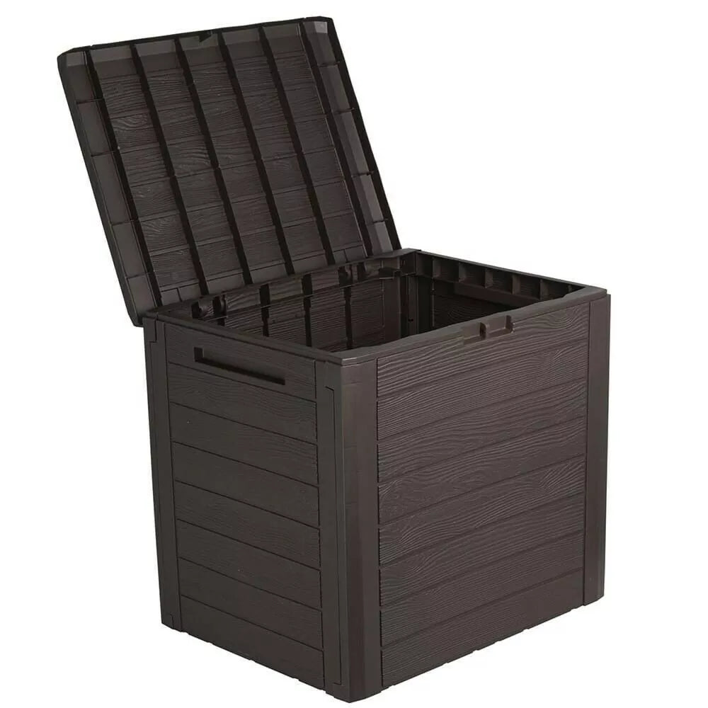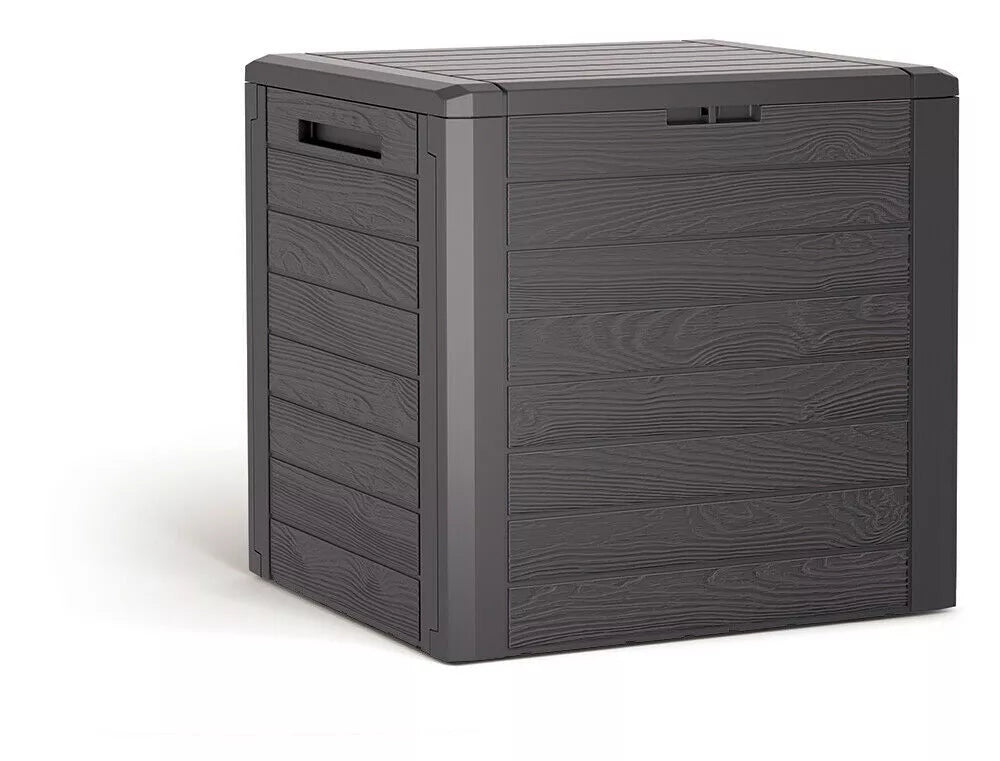 Woodebox multifunctional garden storage box. The perfect solution to keep all your important garden items together in one place. Ideal for storing cushions, blankets, garden tools, smaller furniture or toys for children. The integrated padlock loop gives you the ability to secure contents. Practical storage box - The lightweight design provides sufficient ventilation and protection from rain. Technical data: - Brand: WellHome - Model: Woodebox - UV-resistant. - With space for a padlock. - Length: 460 mm - Width: 585 mm - Height: 550 mm - Capacity: 140L