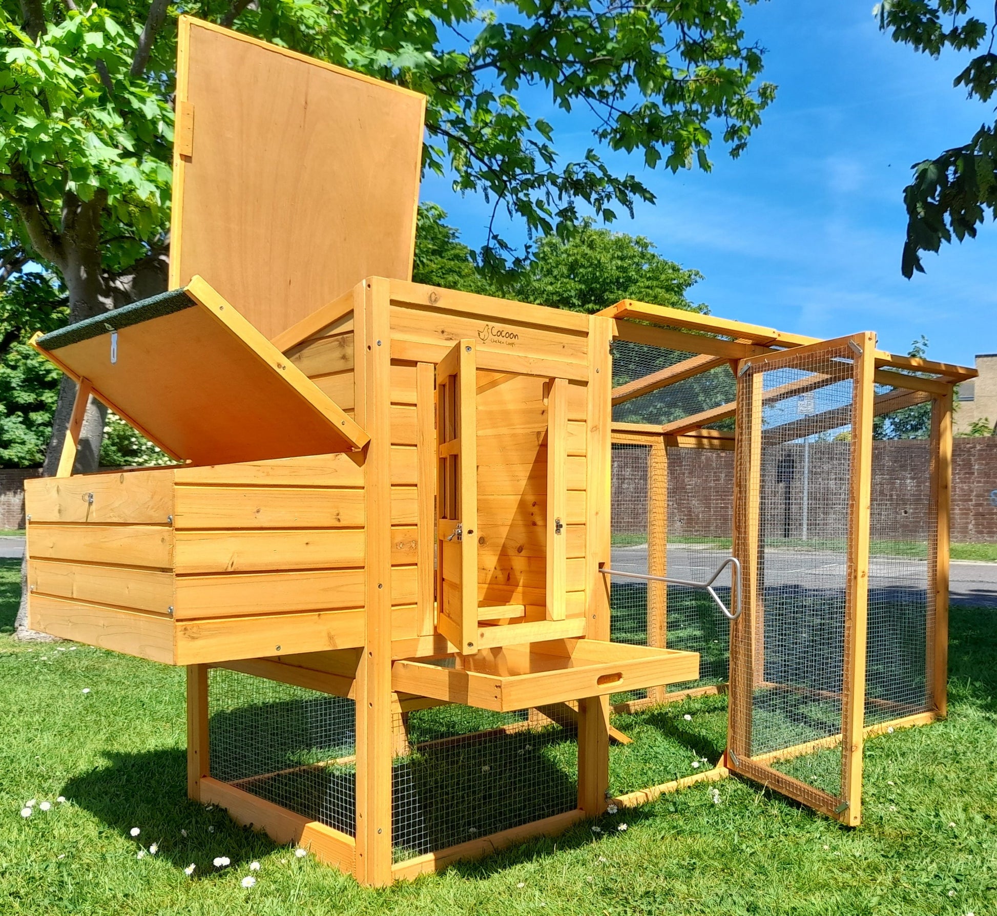 Our stunning 3000WX has a metal lined pull out tray for easy cleaning. A big front door including 4 perspex windows and an access ramp inside the run will make it easy for your hens etc to get in and out and to add ventilation to your coop. A locking arm for the inner door was added allowing fast and easy closure of roost at night without entering the run.