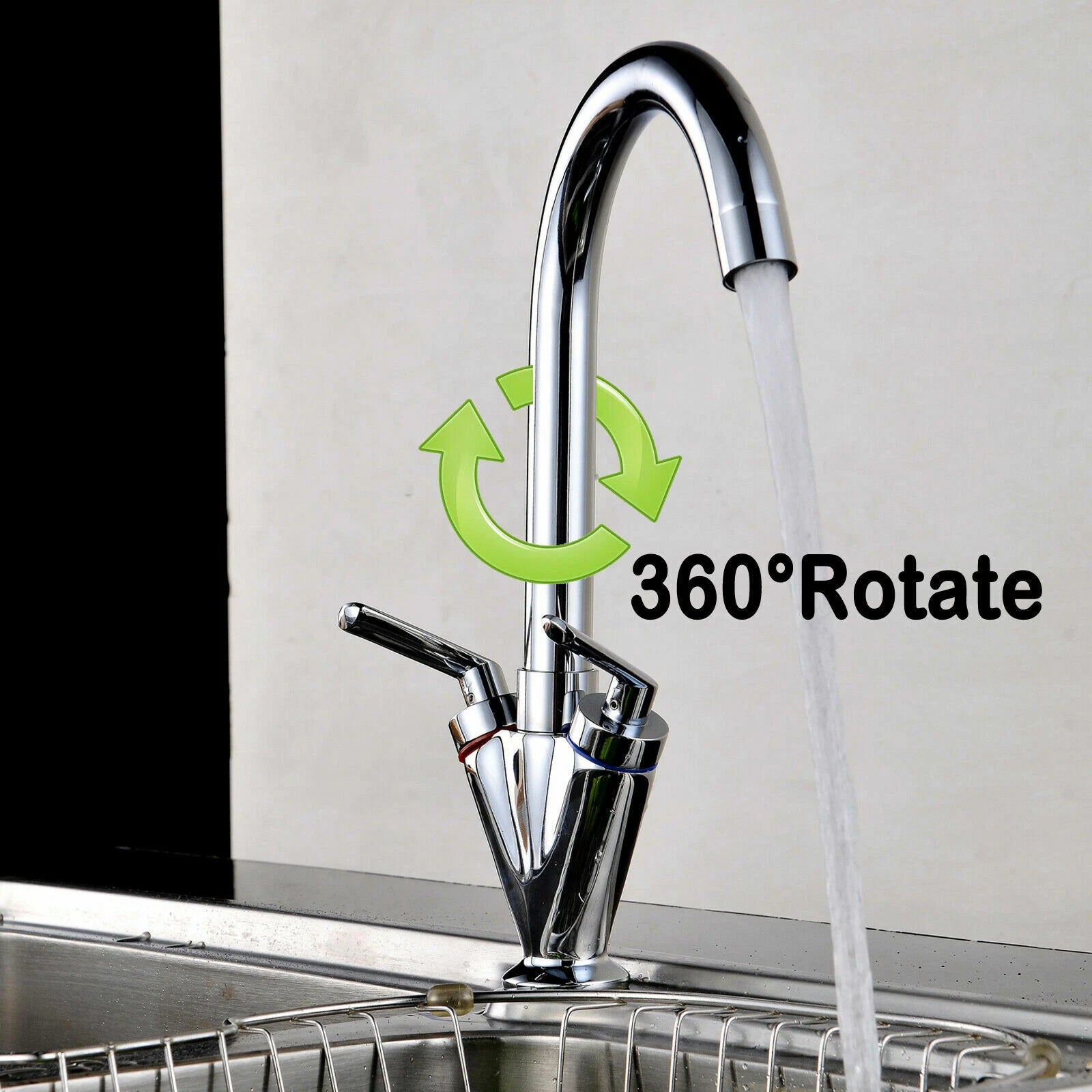 Kitchen Sink Mixer Taps Dual Lever Spout Chrome Mono Brass Faucet Swivel 360°