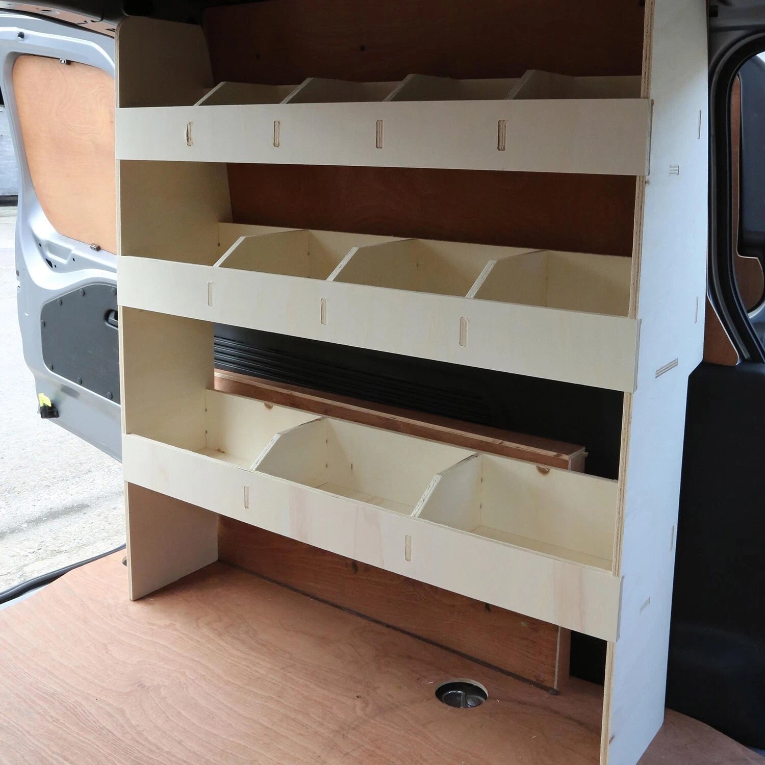Our van racking is made from PREMIUM quality 12mm hardwood plywood. Precision cut mortise and tenon joints with interlocking shelves maximises strength and rigidity of these van shelving units. Designed to withstand sharp turns, bumps, and sudden stops, they are intended for heavy duty daily usage. Our customers are trades people with high standards when it comes to materials and build quality.