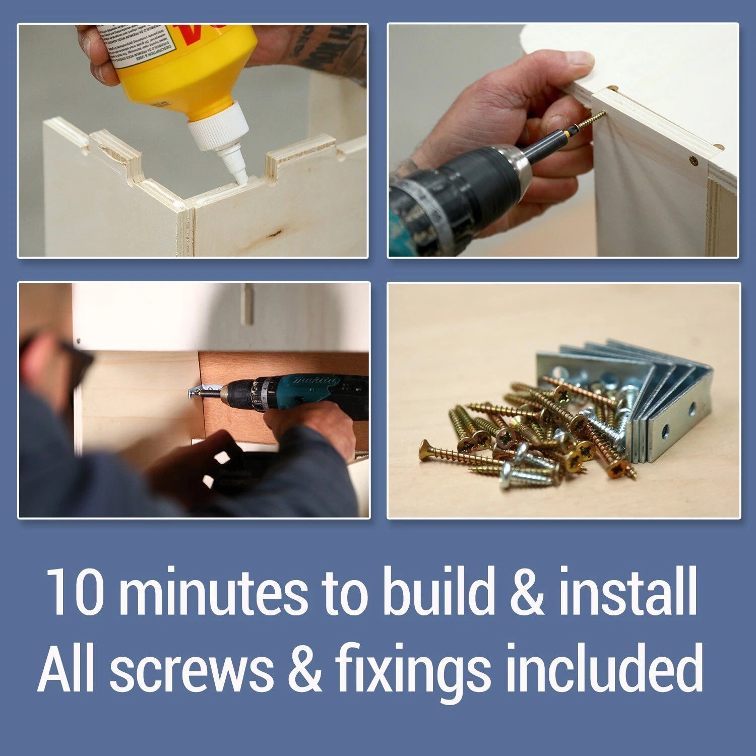 Our items are supplied flat packed and require assembly. We provide all the screws and bolts required for assembly along with easy to follow instructions. A small amount of wood glue is required, which is not supplied. Each shelving unit takes 10 minutes to assemble.