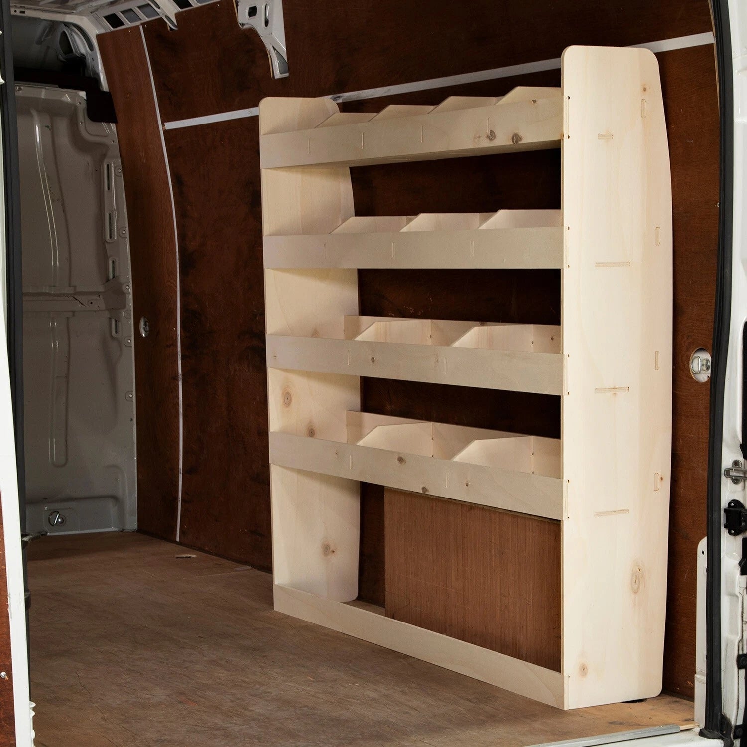 Our van racking is made from PREMIUM quality 12mm hardwood plywood. Precision cut mortise and tenon joints with interlocking shelves maximises strength and rigidity of these van shelving units. Designed to withstand sharp turns, bumps, and sudden stops, they are intended for heavy duty daily usage. Our customers are trades people with high standards when it comes to materials and build quality.