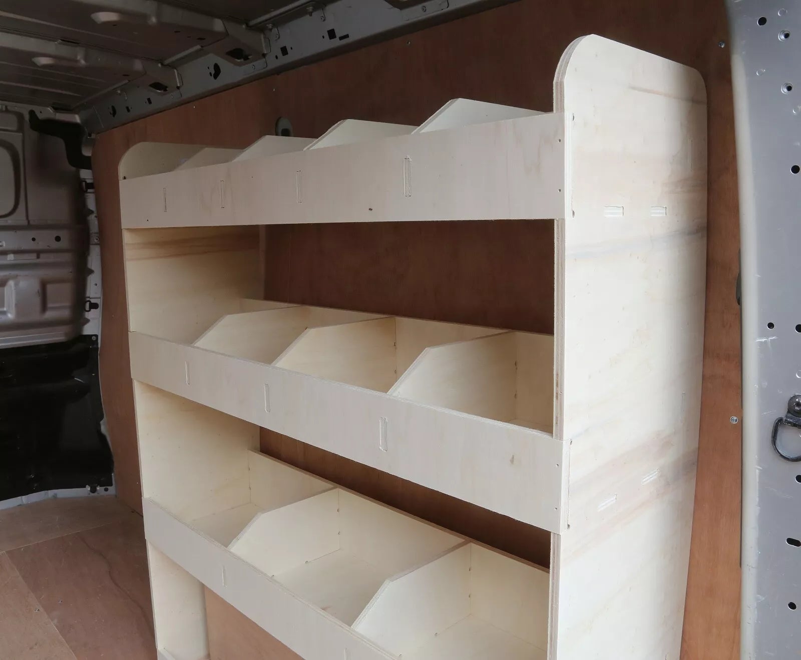 Our van racking is made from PREMIUM quality 12mm hardwood plywood. Precision cut mortise and tenon joints with interlocking shelves maximises strength and rigidity of these van shelving units. Designed to withstand sharp turns, bumps, and sudden stops, they are intended for heavy duty daily usage. Our customers are trades people with high standards when it comes to materials and build quality.
