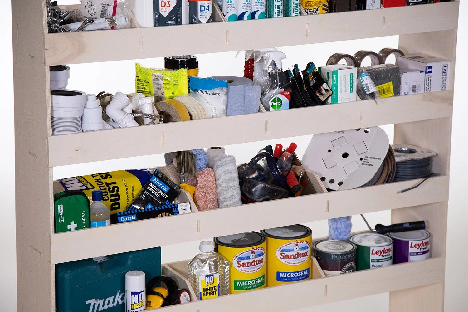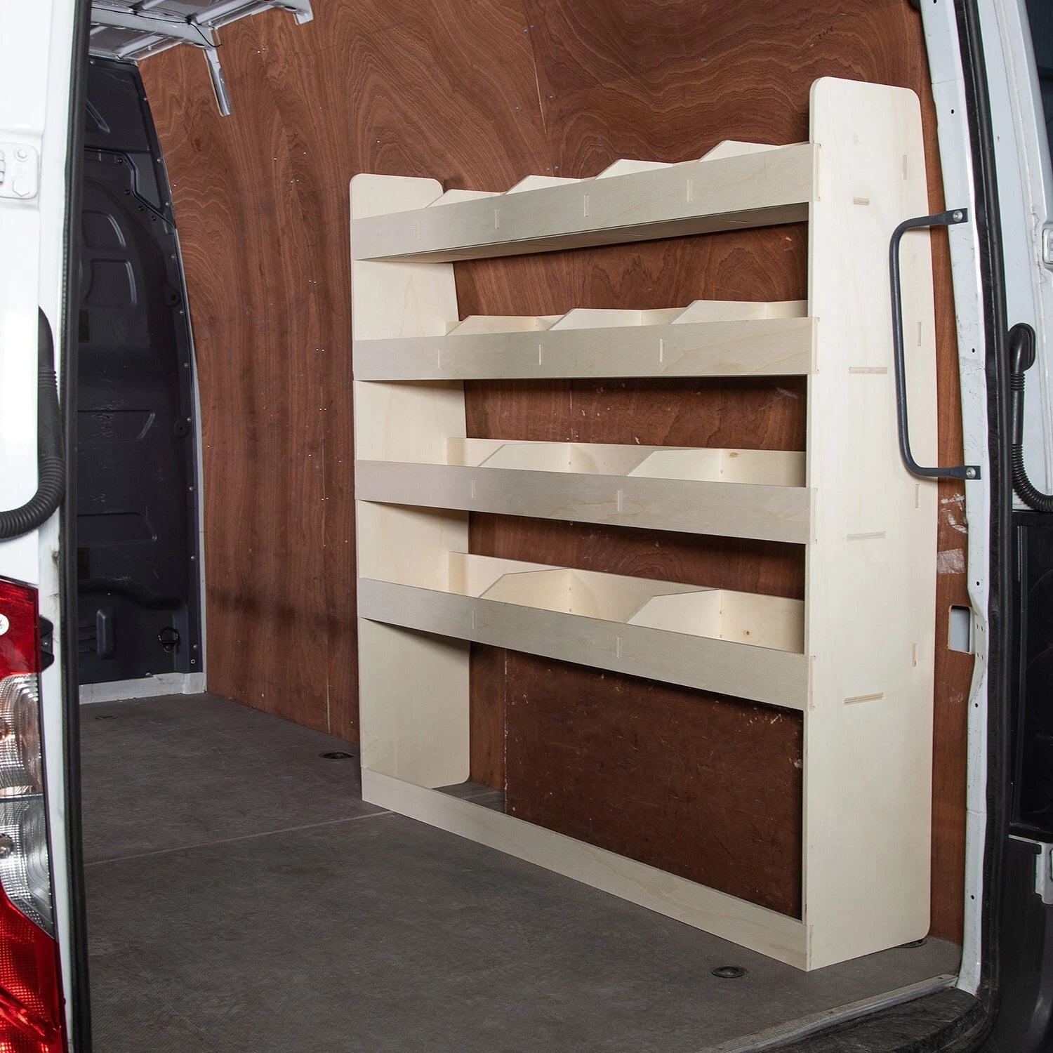 Our van racking is made from PREMIUM quality 12mm hardwood plywood. Precision cut mortise and tenon joints with interlocking shelves maximises strength and rigidity of these van shelving units. Designed to withstand sharp turns, bumps, and sudden stops, they are intended for heavy duty daily usage. Our customers are trades people with high standards when it comes to materials and build quality.